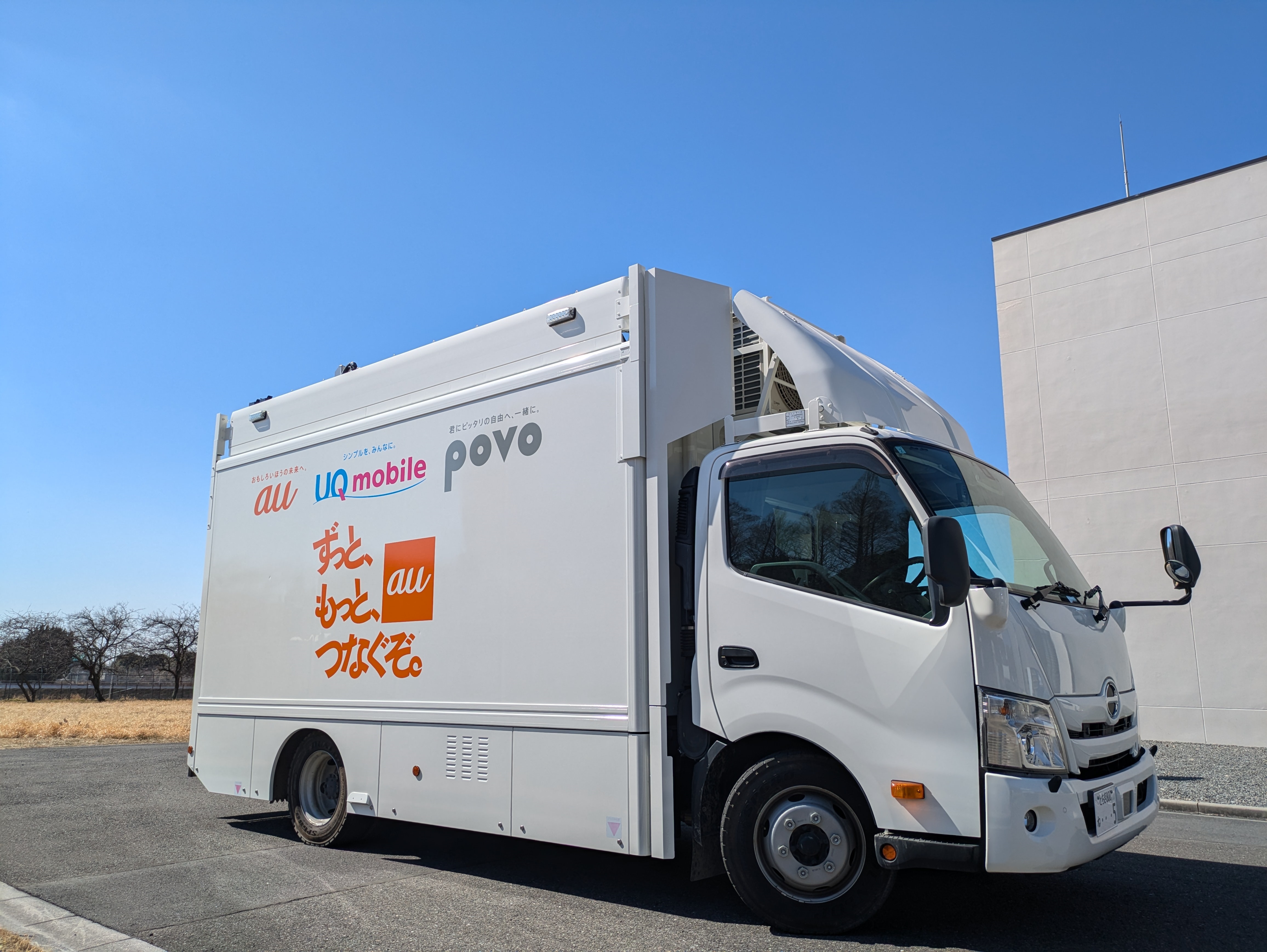 auでは、フェスや花火大会などのイベントで快適に携帯電話サービスをご利用いただけるように、車載型・可搬型の基地局で電波強化対策を行っています。