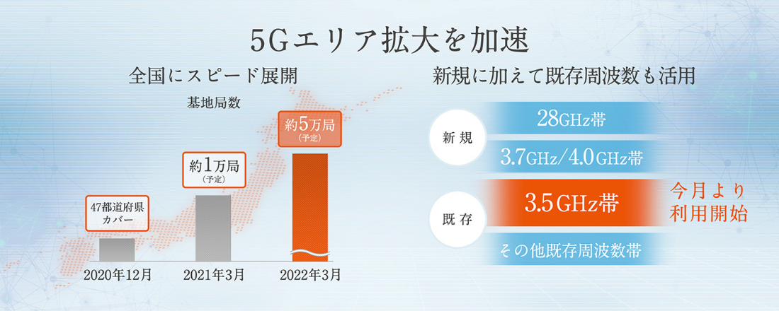5Gの大容量・高速な通信を実現するSub6エリアを関東地方で2.8倍、全国では1.5倍に拡大。