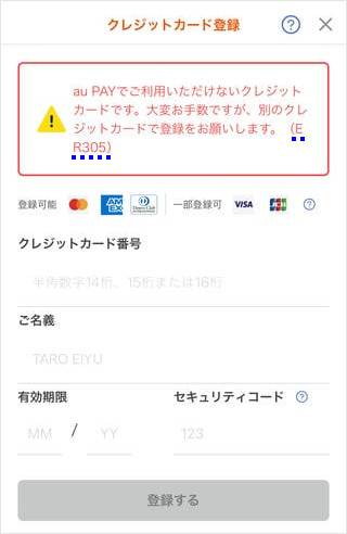 • 別のau PAYアカウント(au ID)に登録されているクレジットカード情報を削除の上、改めてご登録ください。