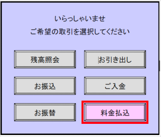 [料金払込]をタップします。 ※各金融機関のATMにて「料金払込(Pay-easy(ペイジー))」や「税金・各種料金払込み」などのメニューを選択します。