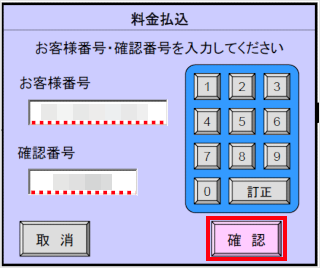「お客様番号(10桁)」/「確認番号(6桁)」を入力し、[確認]をタップします。