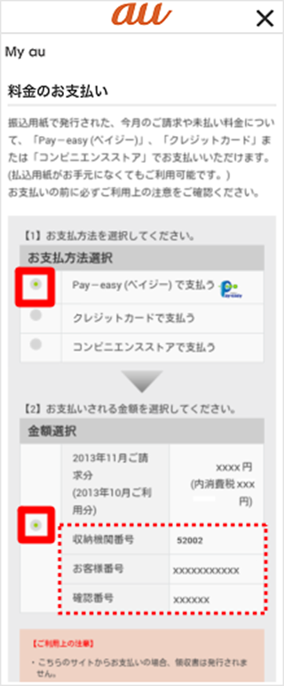[Pay-easy(ペイジー)で支払う]を選択すると、金額選択に「収納機関番号」などが表示されます。