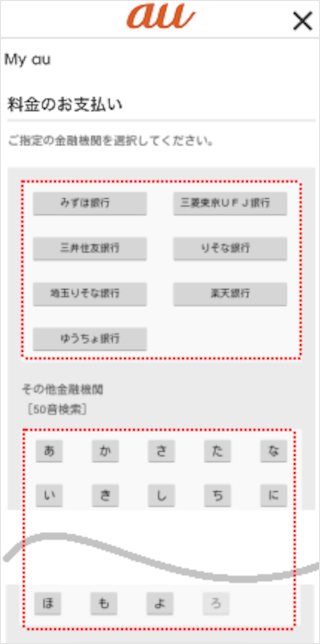 「ご指定の金融機関」を選択します。 ※利用したい金融機関が表示されていない場合は、[その他金融機関(50音検索)]をタップし、表示される画面で金融機関を選択します。