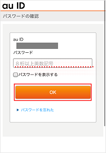 au IDのパスワードを再度入力し[OK]をタップします。 ※Wi-Fi接続での手続きは不可のため、Wi-Fi接続されている場合はOFFにする必要があります。