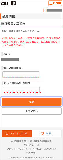 「au ID会員情報サイト」にて新しい暗証番号へ再設定することができます。