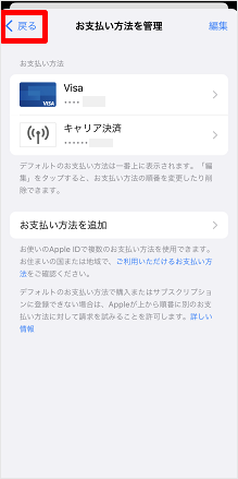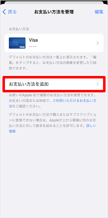 [お支払い方法を追加]をタップします。 ※こちらは既に支払い方法を登録している場合の画面です。 ※支払い方法「なし」の場合はこちらの画面は表示されない為、次の手順に進みます。