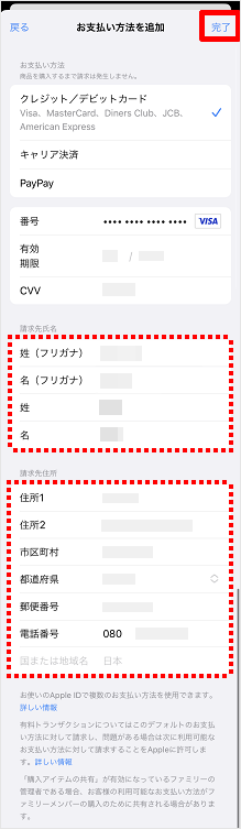 請求先情報が表示されるので、各必要項目を入力し、[完了]をタップします。