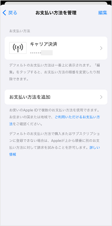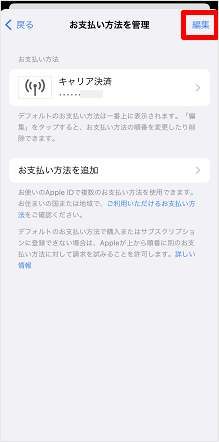支払い方法の管理画面が表示されます。 ※こちらの画面は、設定状況によって表示が異なります。 画像は、支払い方法「キャリア決済」の画面です。