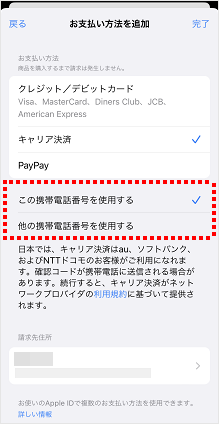 電話番号の項目が表示されるので、請求先に設定するau回線の電話番号を設定します。 「この携帯電話番号を使用する」 操作中デバイスのau回線を請求先に設定する場合に選択します。 以降の操作は手順10へ進みます。 「他の携帯電話番号を使用する」 iPadで操作している場合や、操作中のデバイス以外のau回線を請求先に設定する場合に選択します。 こちらを選択した場合は、次の手順に進みます。