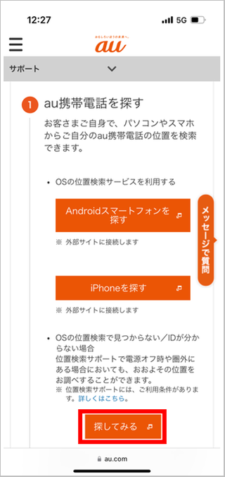 auのお客さまは、「①au携帯電話を探す」の項目内にある[探してみる]をタップします。