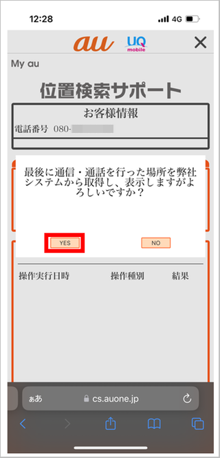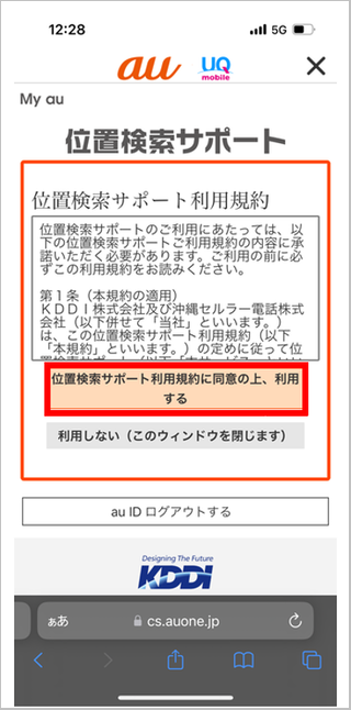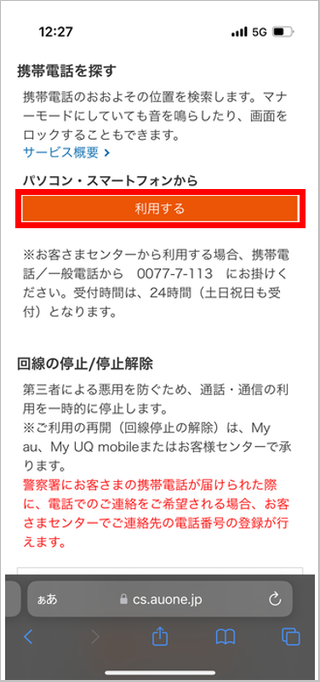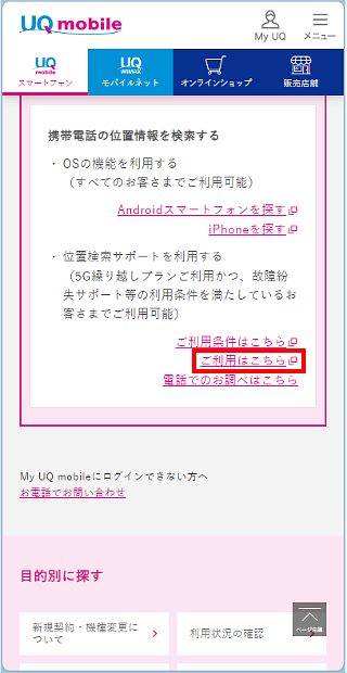 UQ mobileのお客さまは、「携帯電話の位置情報を検索する」の項目内にある[ご利用はこちら]をタップします。
