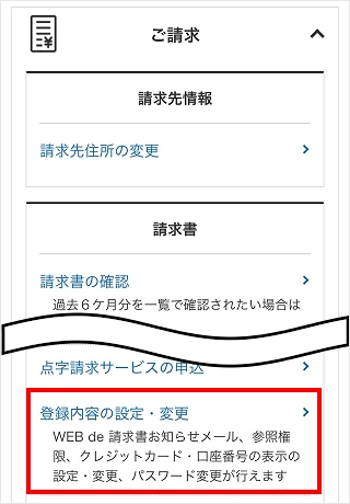 「請求書」内の項目で[登録内容の設定・変更]をタップします。