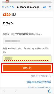 au IDに紐づく電話番号宛てに届いた確認コードを入力し、[ログイン]をタップします。