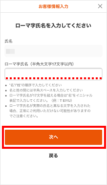 ローマ字氏名を入力し、[次へ]をタップします。