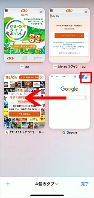 表示されたタブ一覧で不要なタブの[×]をタップするか、タブを矢印の方向へスライドするとタブを閉じることができます。 以上で操作は完了です。