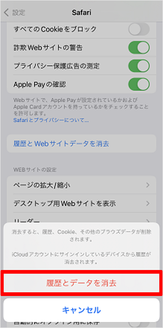 [履歴とWebサイトデータを消去]をタップします。