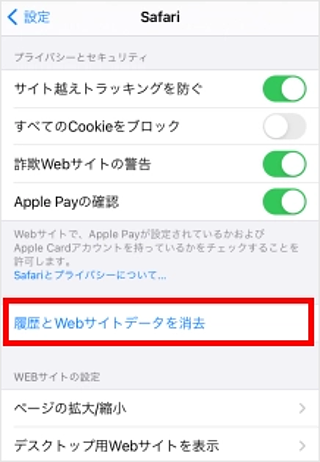 ブラウザ(safariアプリ)のキャッシュ/Cookieの削除は設定アプリで削除ができます。