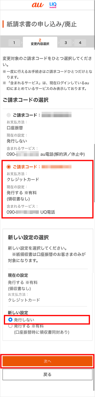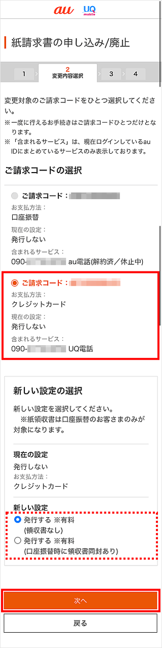 手続きをしたいご請求コードを選択して、新しい設定にチェックを入れ、[次へ]をタップします。