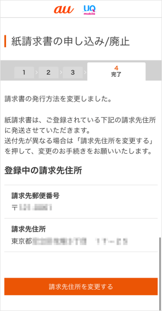 以上でお手続き完了です。次回発行の請求書にて変更となります。 ※お送り先の住所をご確認いただき、変更が必要な場合は[請求先住所を変更する]をタップしてください。 請求先住所の変更方法はこちら