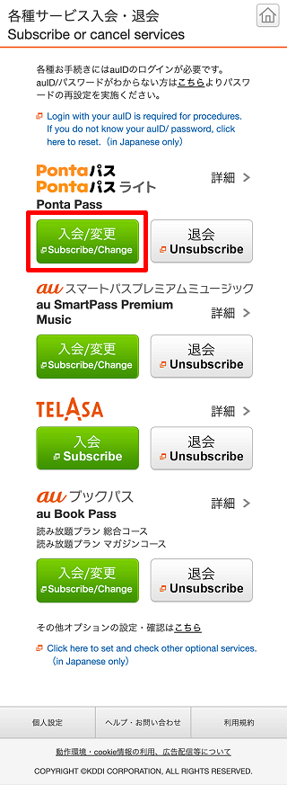 ご利用の端末より「各種サービス入会・退会」ページを開きます。