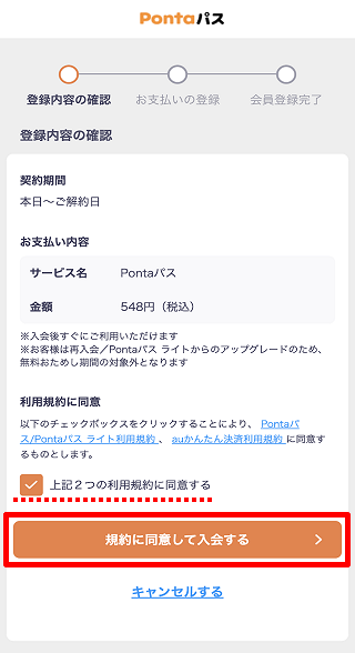 利用規約の同意欄にチェックを入れ、[規約に同意して入会する]をタップします。