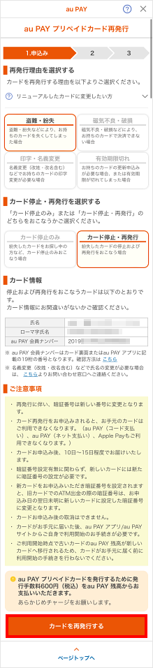 「au PAY サイト」のカード再発行ページで申し込みできます。