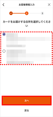 カードをお届けする住所を選んで、[次へ]をタップします。