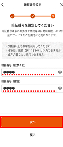 カードの暗証番号を設定して、[次へ]をタップします。