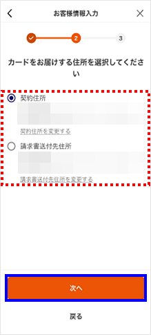 カードをお届けする住所を選択し、[次へ]をタップします。