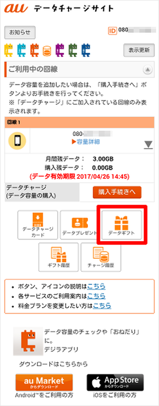 [データチャージサイト]にアクセスし、au IDとパスワードでログインします。