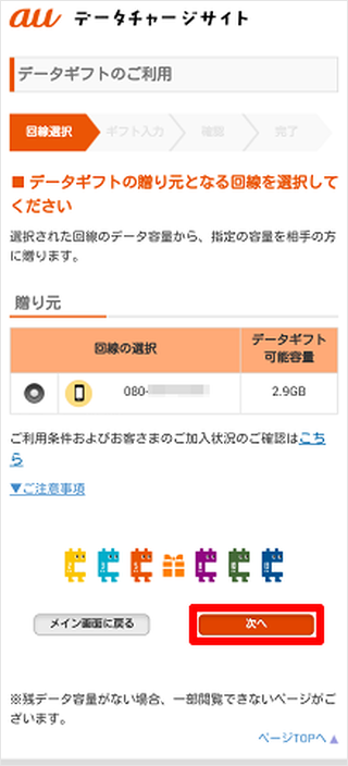 データギフトの贈り元となる回線を選択し、[次へ]をタップします。