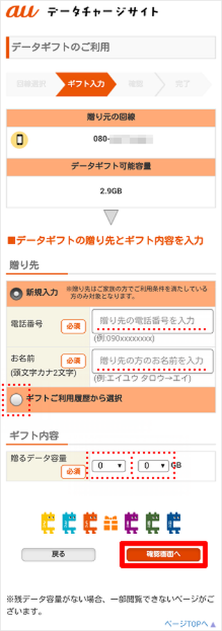 データギフトの贈り先回線の情報・贈るデータ容量を入力し、[確認画面へ]をタップします。