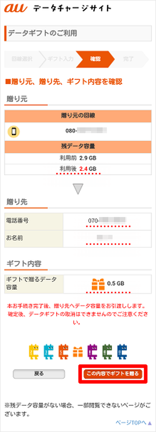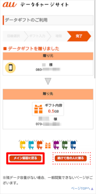 ※完了すると贈り先のデータ容量が増えます。「もらう」ための操作は必要ありません。