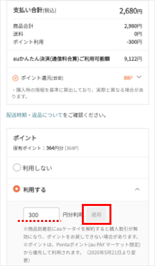 Pontaポイント(au PAY マーケット限定)は1ポイントが1円、auポイントは1.2ポイントが1円としてお買い物で利用できます。
