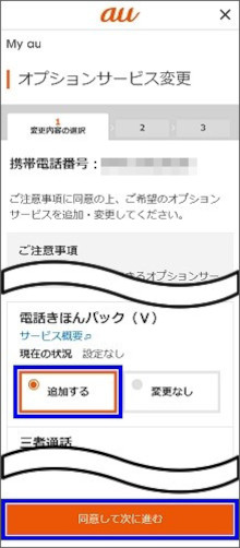 「電話きほんパック(V)」の[追加する]にチェックを入れ、[同意して次に進む]をタップします。
