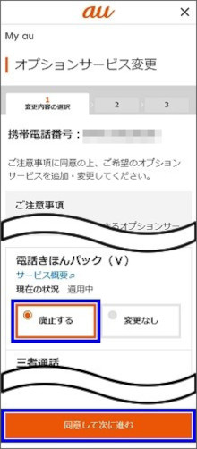 「電話きほんパック(V)」の[廃止する]にチェックを入れ、[同意して次に進む]をタップします。