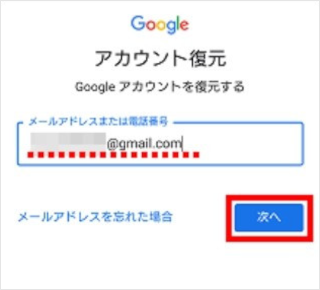 「アカウント復元」にアクセスし、Googleアカウント(Gmailアドレス)を入力後、[次へ]をタップします。