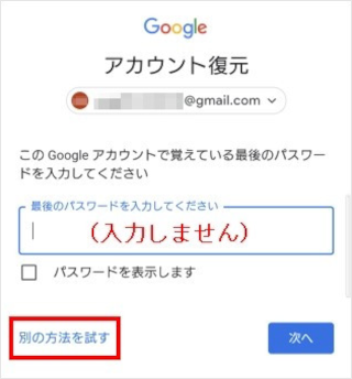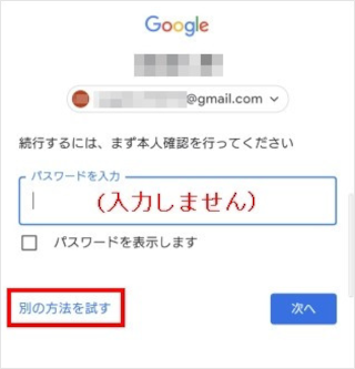 手順②と同様に、パスワードは入力はせずに[別の方法を試す]をタップします。