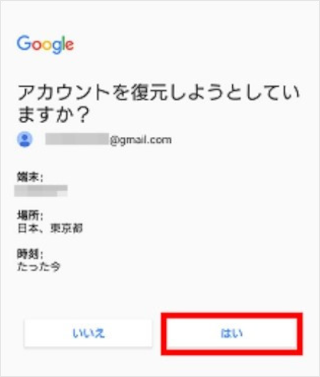 「アカウントを復元しようとしていますか?」で[はい]をタップします。