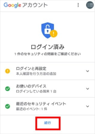 セキュリティの問題をご確認の上、[続行]をタップします。