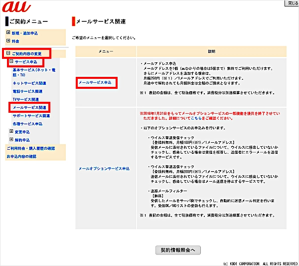 ご契約メニューを[ご契約内容の変更]→[サービス申込]→[メールサービス関連]の順にクリックします。