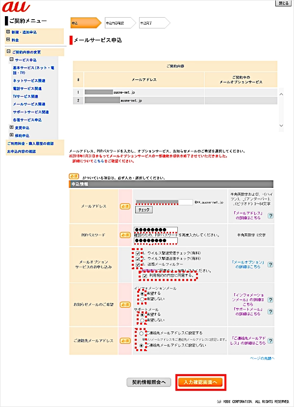 メールアドレス/POPパスワード、そのほか必要事項を入力したら、[入力確認画面へ]をクリックします。