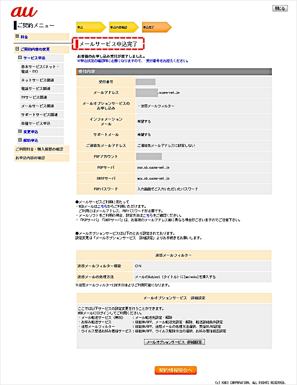 「メールサービス申込完了」と表示されたら、手続き完了です。