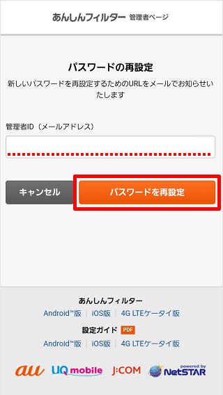 管理者ID(メールアドレス)を入力し、[パスワードを再設定]をタップします。
