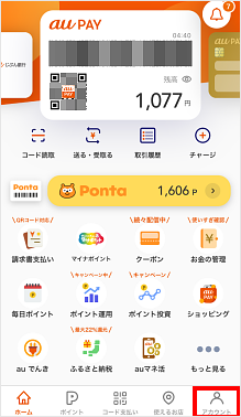 「au PAY アプリ」の「アカウント」でチャージ履歴を確認できます。