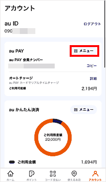 「au PAY」の[メニュー]をタップします。