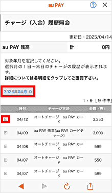※対象年月を選択すると、選択した月のチャージ履歴が表示されます。