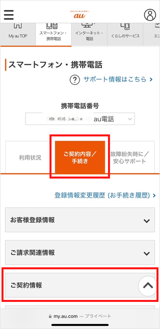 [ご契約内容/手続き]をタップし、[ご契約情報]をタップします。