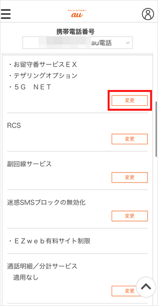 「・お留守番サービス・テザリングオプション・5G NET」の[変更]をタップします。