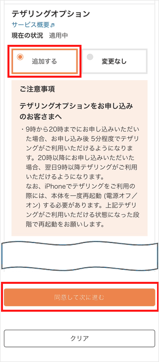 注意事項をご確認いただき、[追加する]をタップし、[同意して次に進む]をタップします。